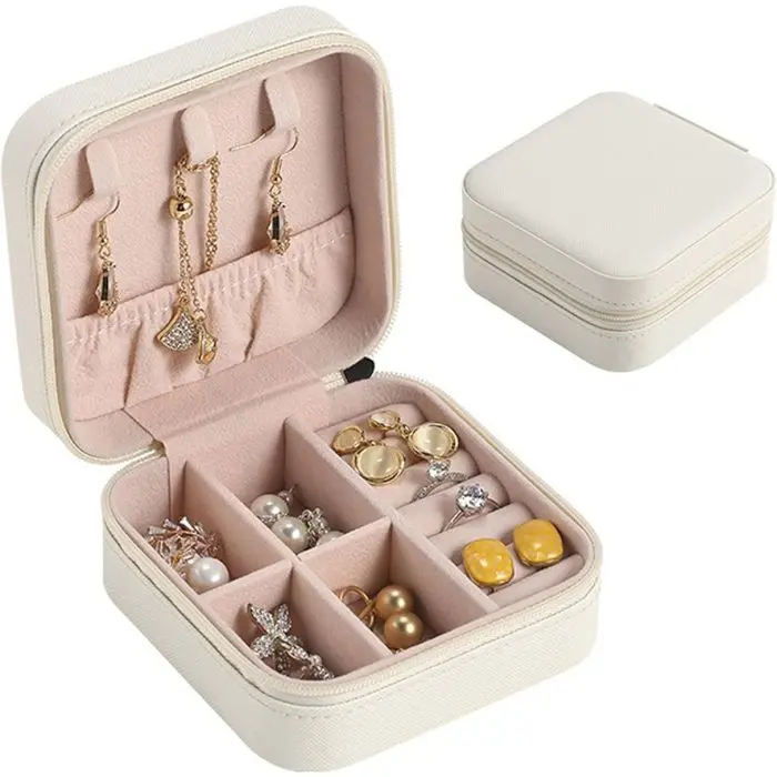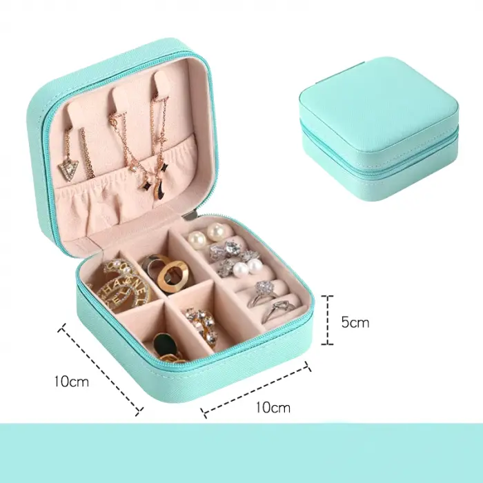 Hermoso joyero cuadrado compacto, fabricado en cuero PU que hace que sea sencillo el mantener ordenadas y cuidadas tus joyas.