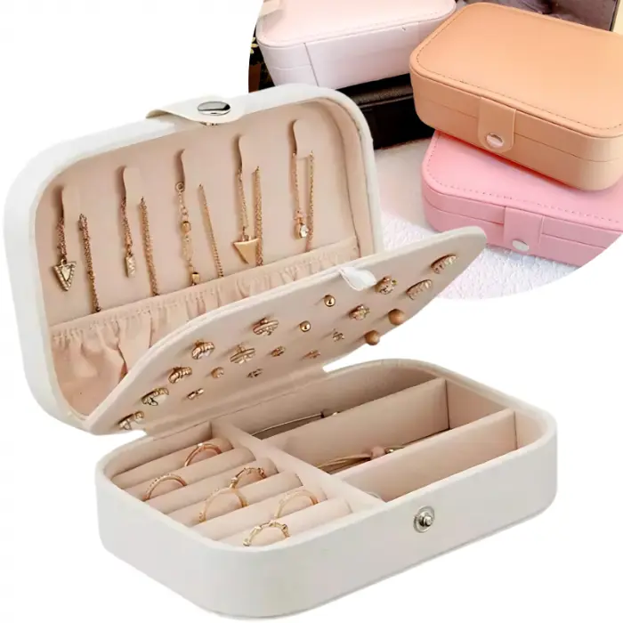 Medidas: 17cm x 12cm x 5,5cmHermoso joyero rectangular, fabricado en cuero PU que hace que sea sencillo el mantener ordenadas y cuidadas tus joyas.Posee compartimientos para anillos, collares y aritos.Colores SURTIDOS sujeto a DISPONIBILIDAD