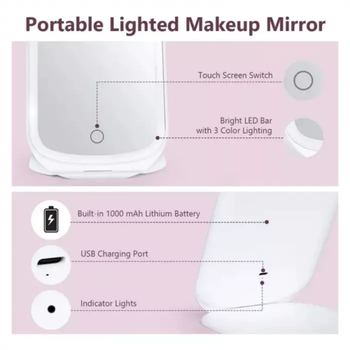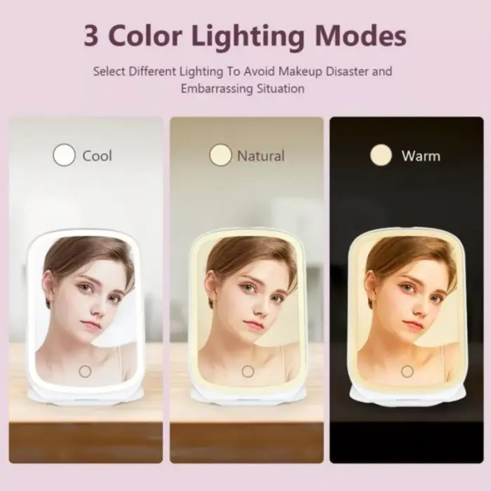 - 3 modos: elige entre tres temperaturas de color de luz: luz fría, natural o cálida. Este pequeño espejo compacto con luz se adapta a cada experimento de cuidado de la piel en tu sala de maquillaje