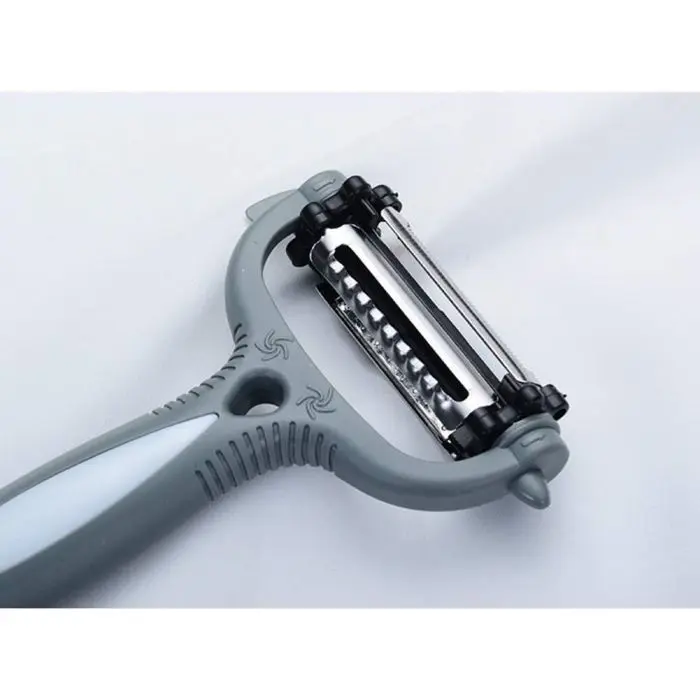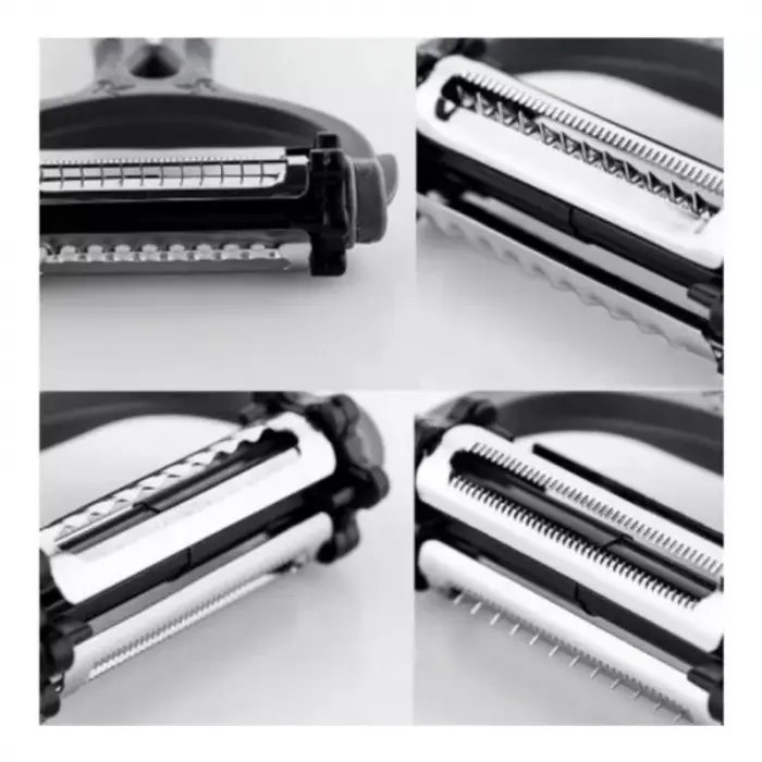 Cuenta con tres tipos de cuchillas que cumplen diferentes funciones: pelar papas, cortar verduras, frutas y rallador.